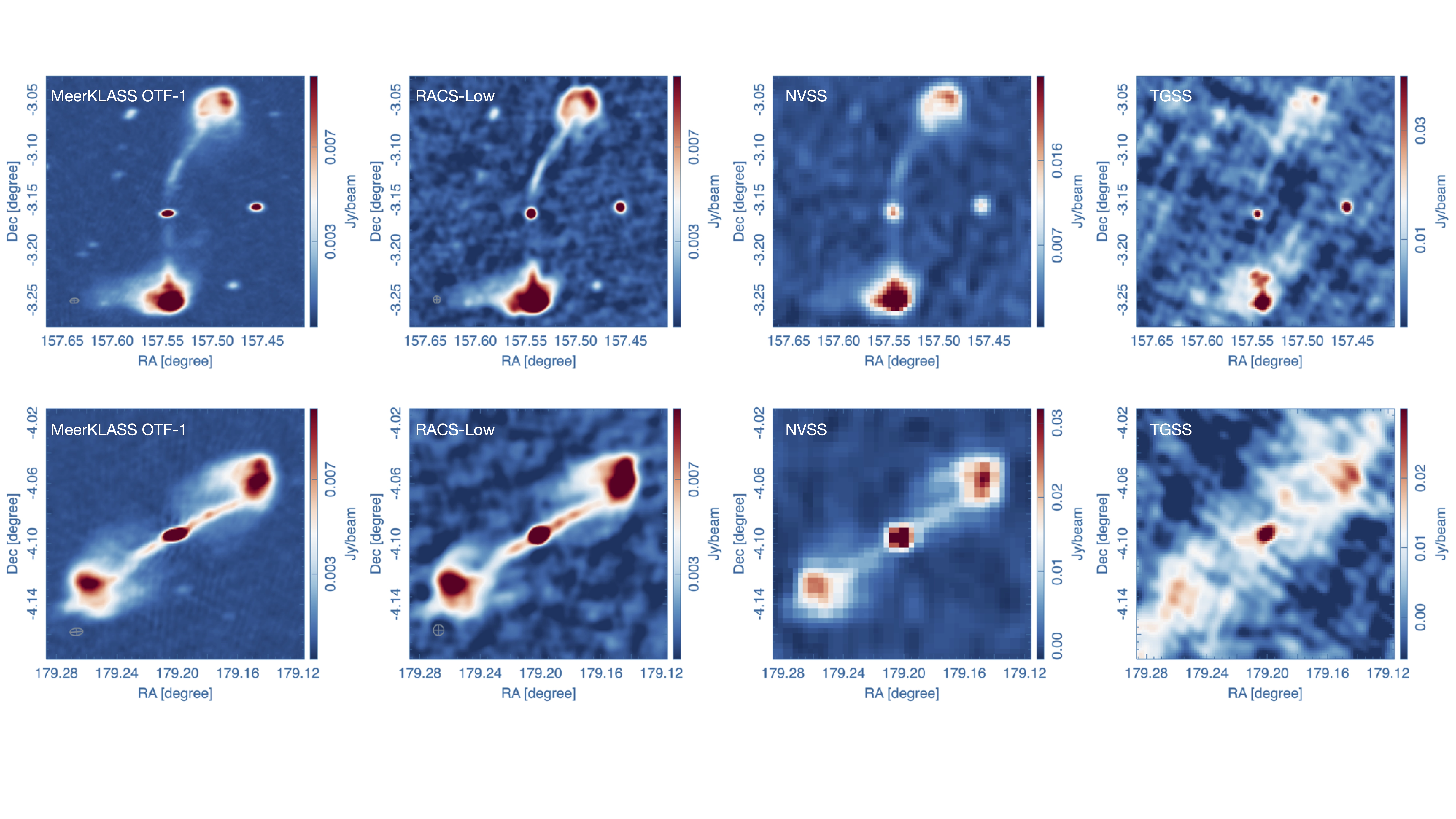 Fig. 2: Two giant radio galaxies observed (left to right) in MeerKLASS DR1, RACS-low, NVSS and TGSS (see Paul et al, Figure 10).