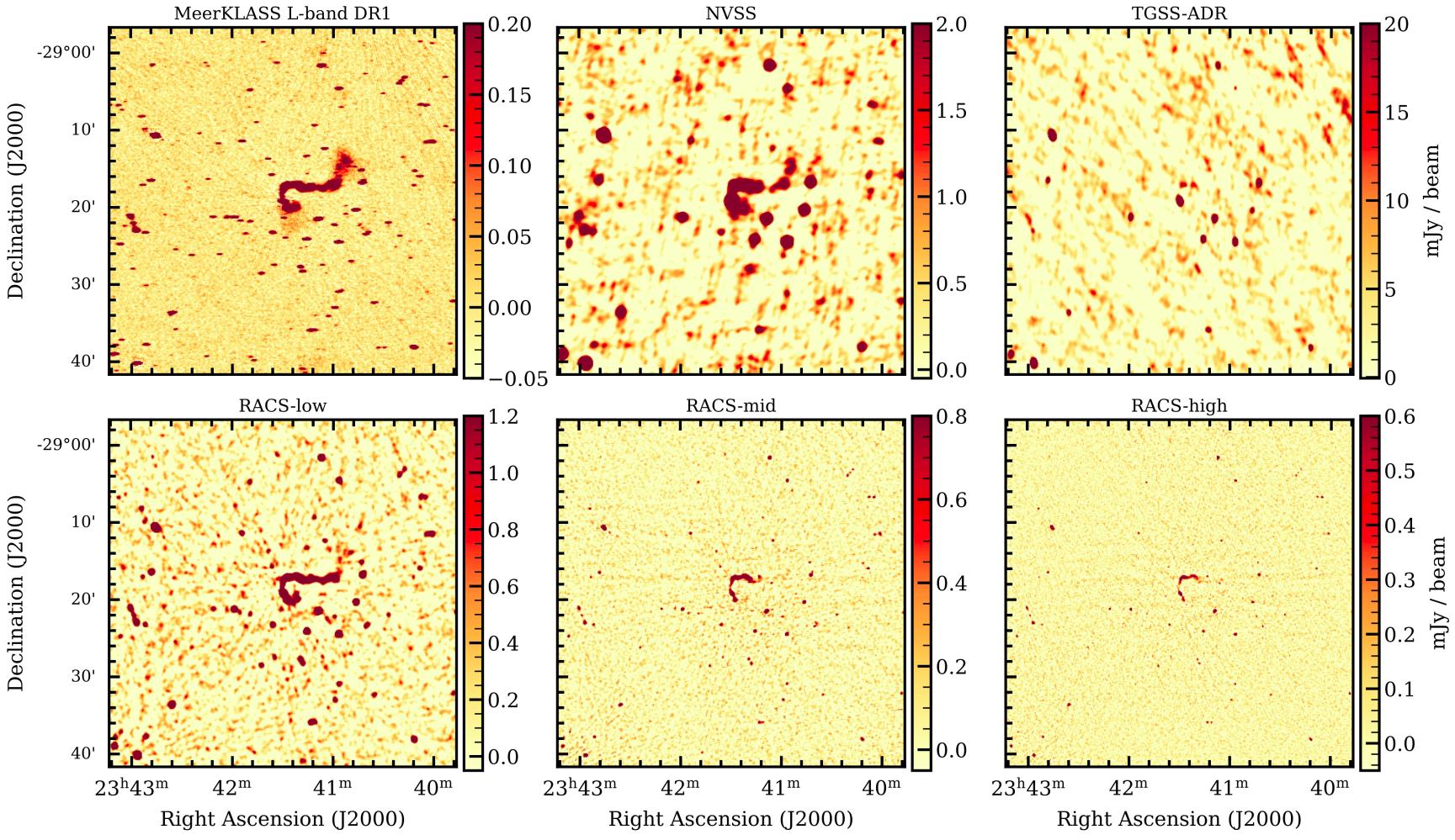 Fig.4: Images of a particular giant radio galaxy in MeerKLASS L, NVSS, TGSS-ADR and RACS-low, -mid and -high (see Mangla et al Figure 6).